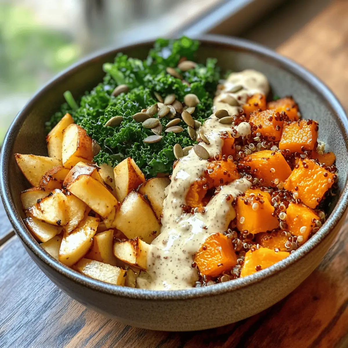 Gather your roasted butternut squash, massaged kale, diced apple, and dried cranberries in a serving area. To assemble each bowl of the Autumn Glow Quinoa Bowls, start with a generous scoop of fluffy quinoa at the base. Layer on the roasted squash, kale, diced apple, and a sprinkle of dried cranberries for a pop of sweetness. Don’t forget to add your choice of pumpkin seeds or pecans for that satisfying crunch.