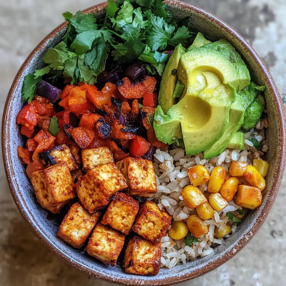 - Assemble the bowl: layer spicy rice, crispy tofu, roasted vegetables, sweet corn, black beans, lettuce, avocado, and pico de gallo.