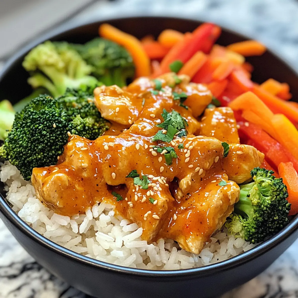 To serve, place a generous portion of the cooked rice at the bottom of each bowl. Spoon the chicken and vegetable mixture over the rice and garnish with chopped green onions for freshness. For an extra touch, consider a sprinkle of sesame seeds. Your Bang Bang Chicken Bowl is now ready to enjoy!