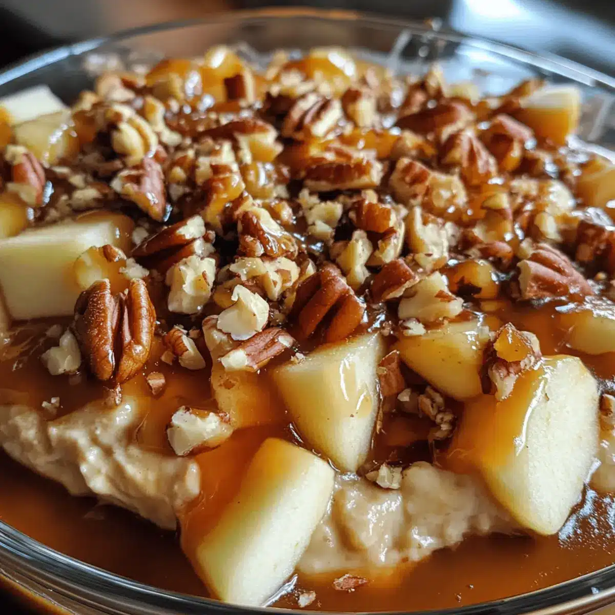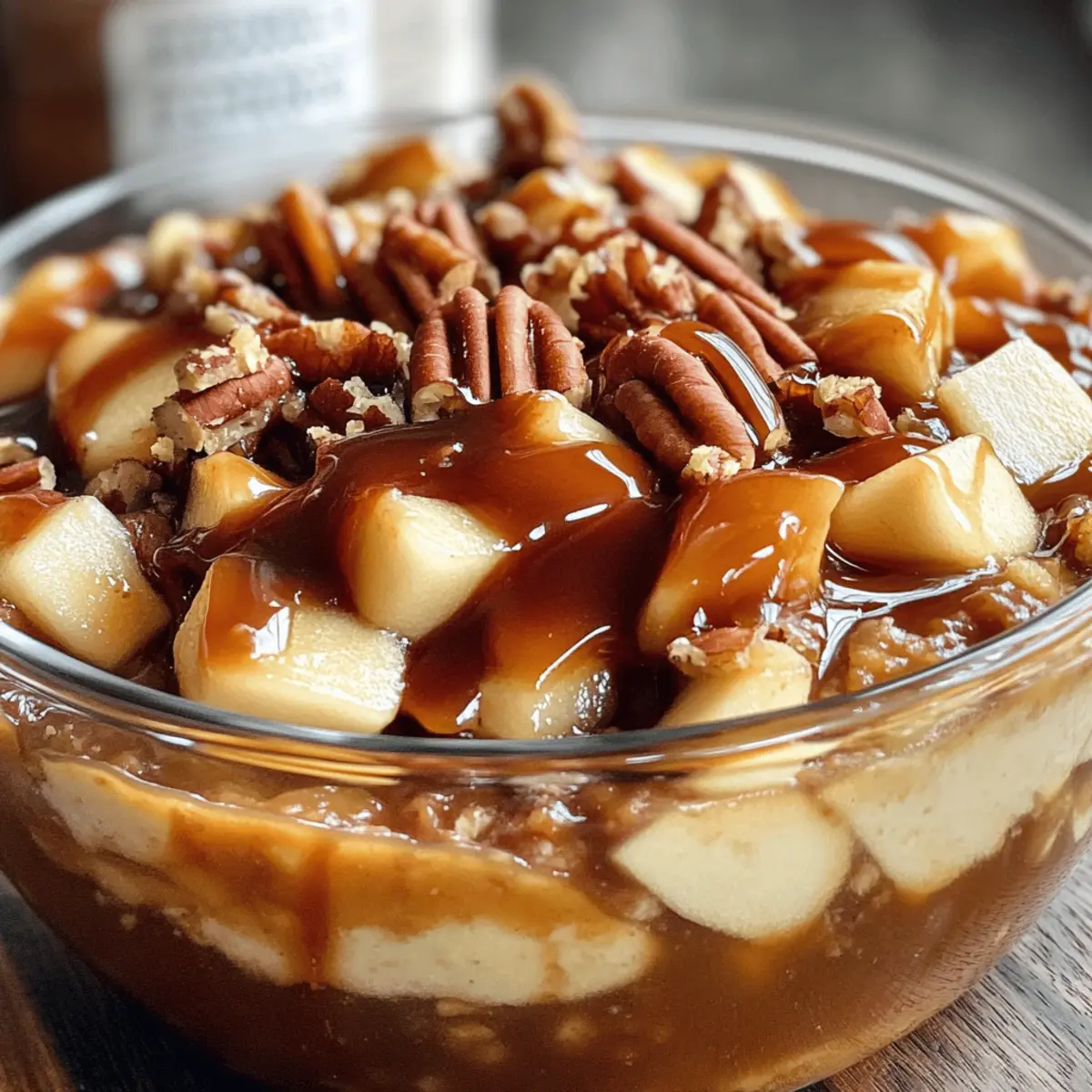 Sprinkle diced apples (about 1-2 cups) on top of the caramel layer, evenly distributing them for a delightful crunch with every bite. If you’d like, add crushed pecans for an extra nutty touch, giving your dip a lovely texture contrast. The combination of fruit and caramel will tantalize your taste buds.