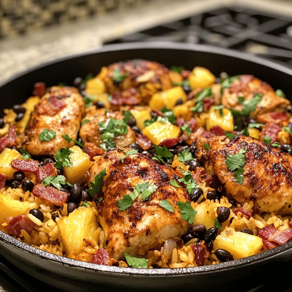 Absolutely! This Caribbean Chicken & Rice recipe can easily be made vegetarian by omitting the bacon and chicken, using vegetable broth, and adding extra beans or fresh veggies. If you have allergies, note that some spices like cayenne could cause reactions, so always check your spice blends and ingredients carefully.