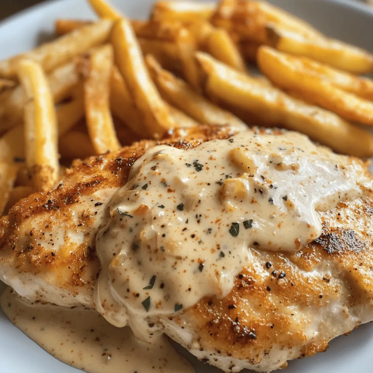 - On a serving plate, arrange your crispy fries alongside the chicken fillets, drenching them with the remaining sauce from the skillet. Garnish with fresh parsley, enhancing both color and flavor. Serve immediately for a comforting meal experience.