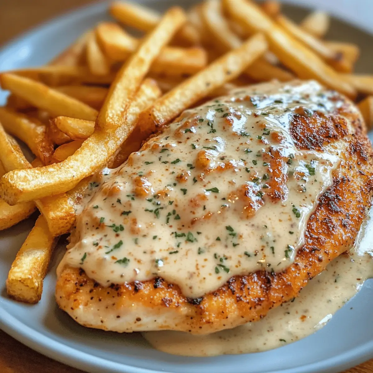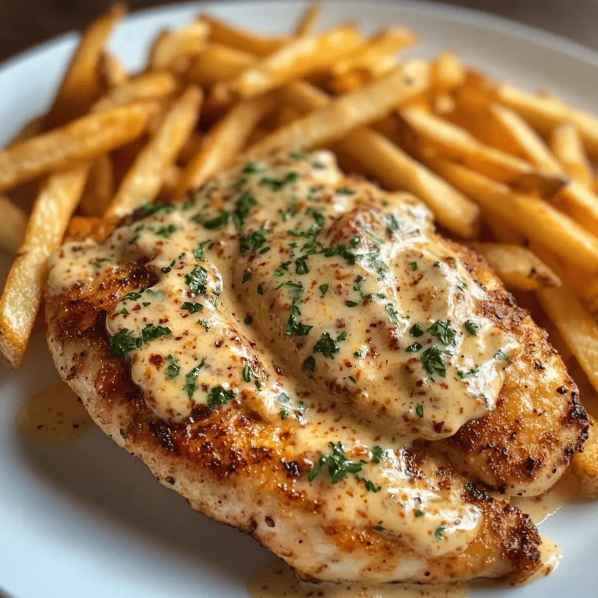 On a serving plate, arrange your crispy fries alongside the chicken fillets, drenching them with the remaining sauce from the skillet. For an added touch, you can garnish with fresh parsley, enhancing both color and flavor. Serve this delightful Chicken Fillet in Spicy, Creamy Garlic-Parmesan Sauce immediately for a comforting meal experience.