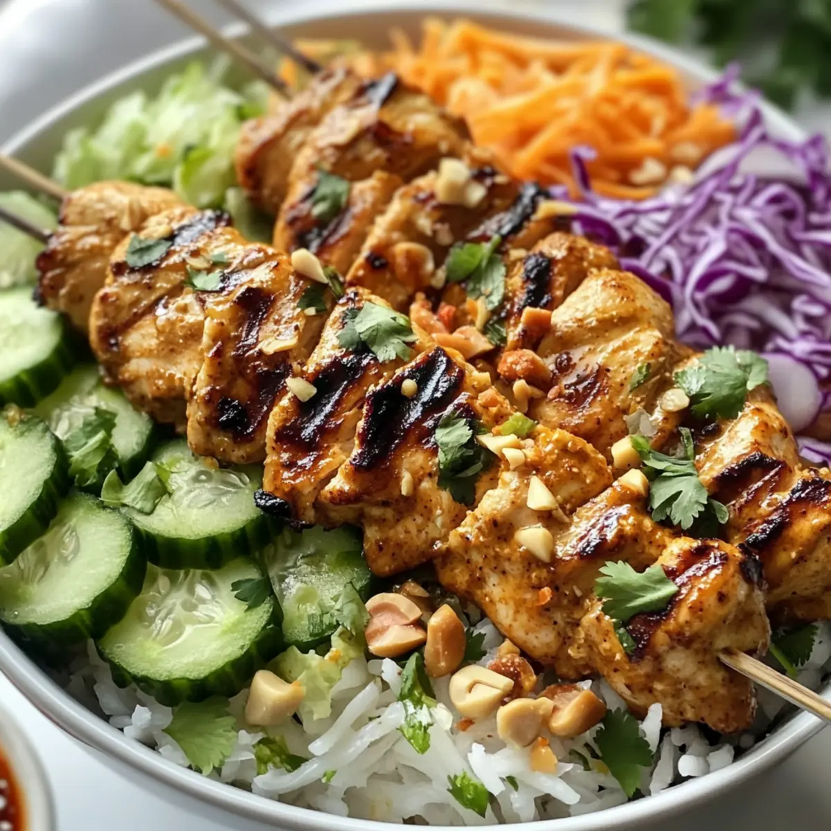 Prepare your serving bowls by starting with a base of rice or noodles. Layer on a colorful mixture of shredded cabbage, sliced cucumbers, julienned carrots, and fresh herbs. Place the grilled chicken skewers on top, allowing the vibrant components of your Chicken Satay – Spring Roll Bowls to shine through, creating a lovely visual appeal.