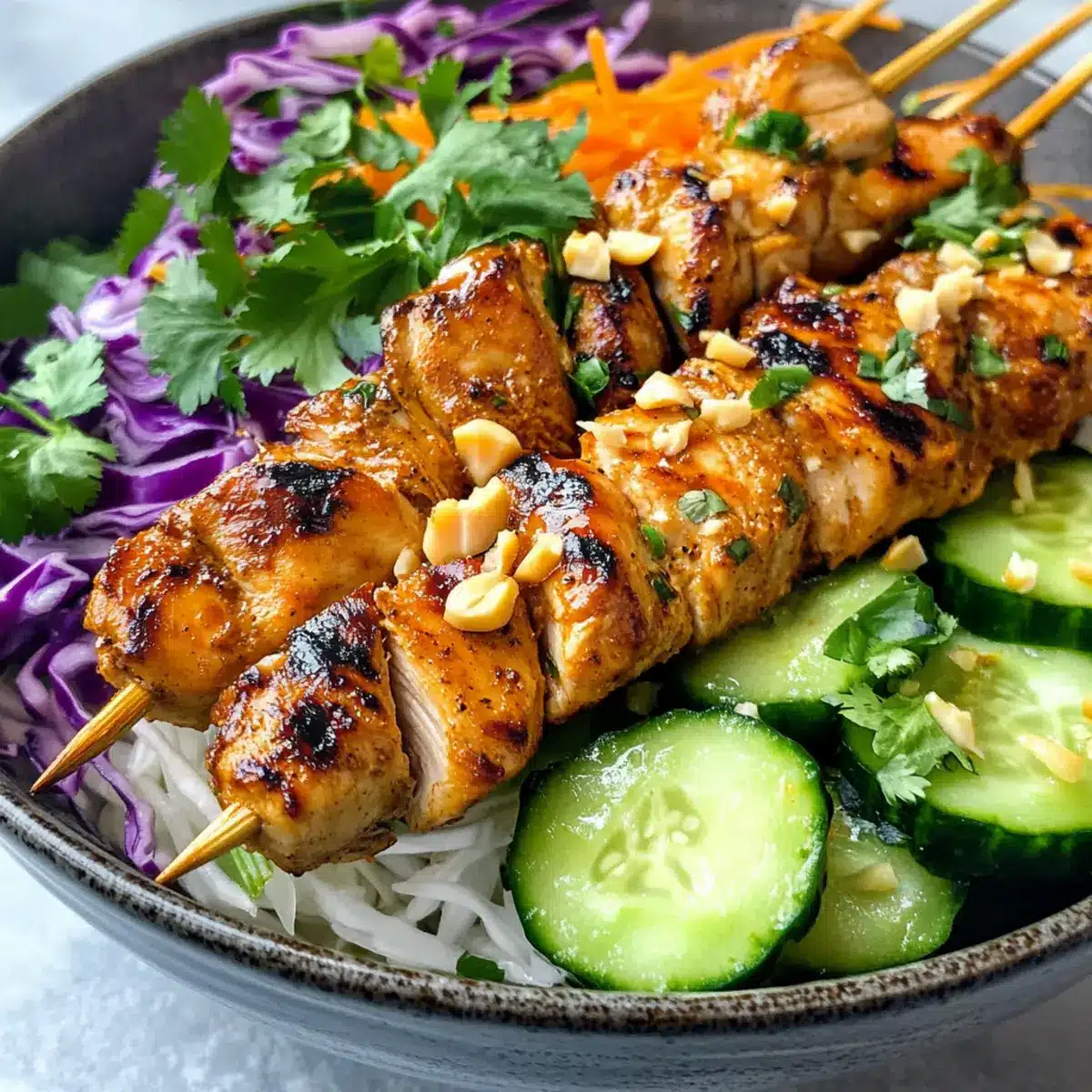 These Chicken Satay – Spring Roll Bowls are perfect for meal prep enthusiasts! You can marinate the chicken up to 24 hours in advance for maximum flavor and tenderness, simply combining the marinade ingredients and refrigerating the chicken. The components of the bowl, like chopped vegetables, can also be prepped ahead and will stay fresh in airtight containers in the fridge for up to 3 days. To serve, reheat the chicken skewers in a skillet for a few minutes. Assemble your bowls right before enjoying them, layering the veggies, chicken, and sauce for a restaurant-quality meal ready in minutes. Just imagine the time you’ll save on busy weeknights!