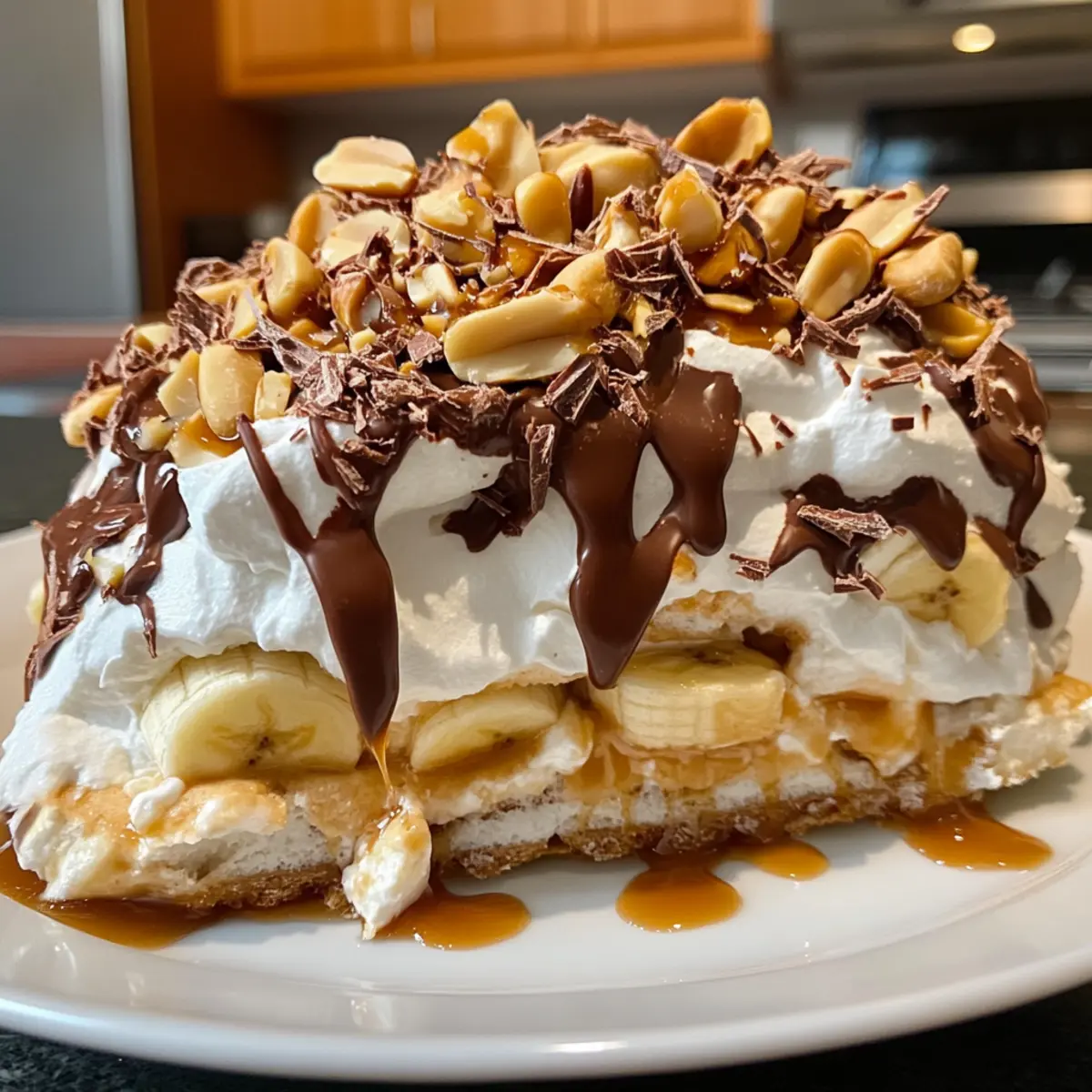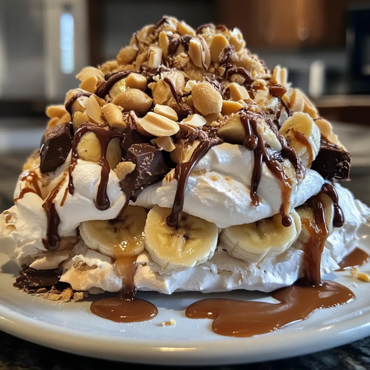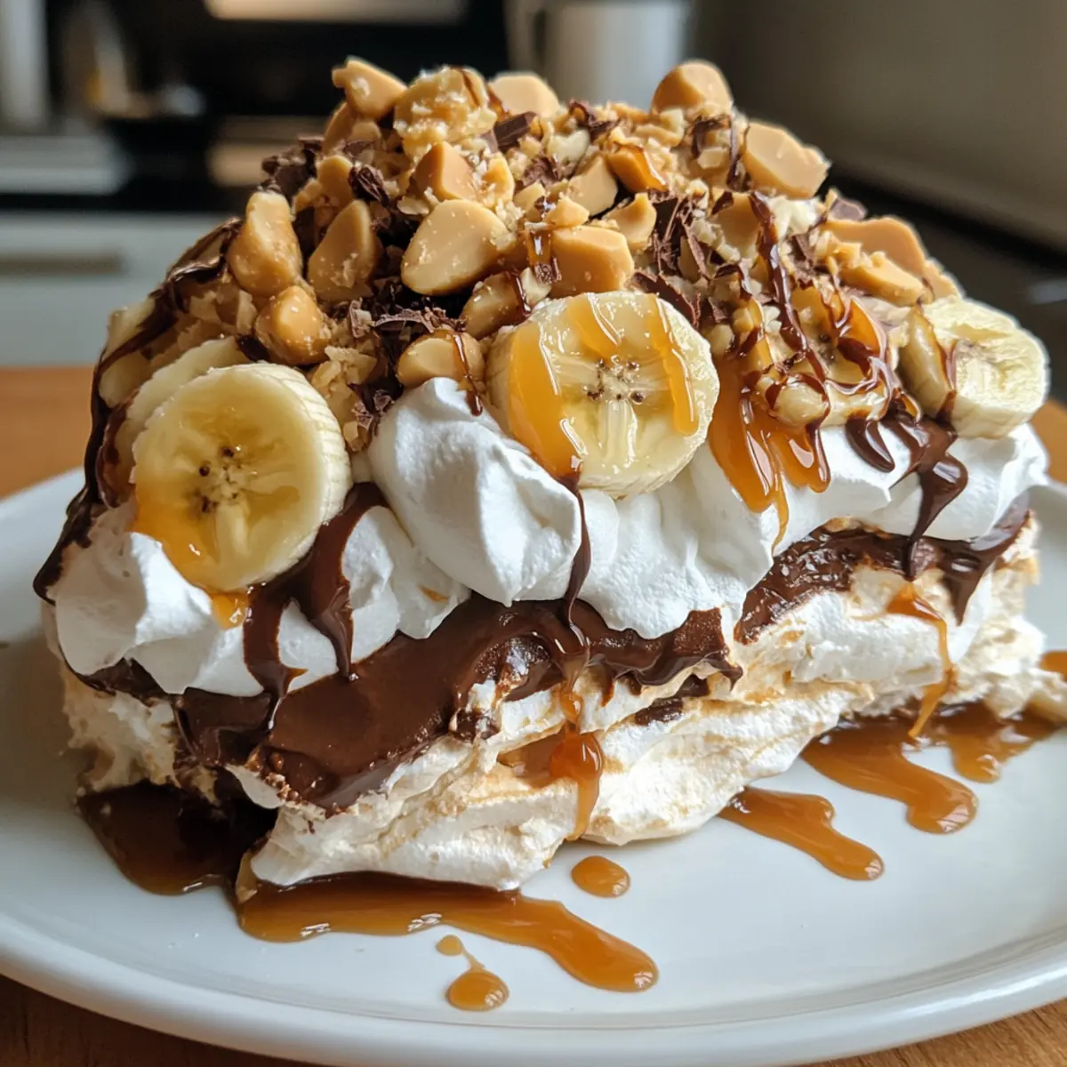 - Assemble the Pavlova: Place the cooled meringue on a serving platter and cover with whipped cream. Add caramelized bananas, drizzle with salted caramel, and finish with chopped peanuts and shaved chocolate.