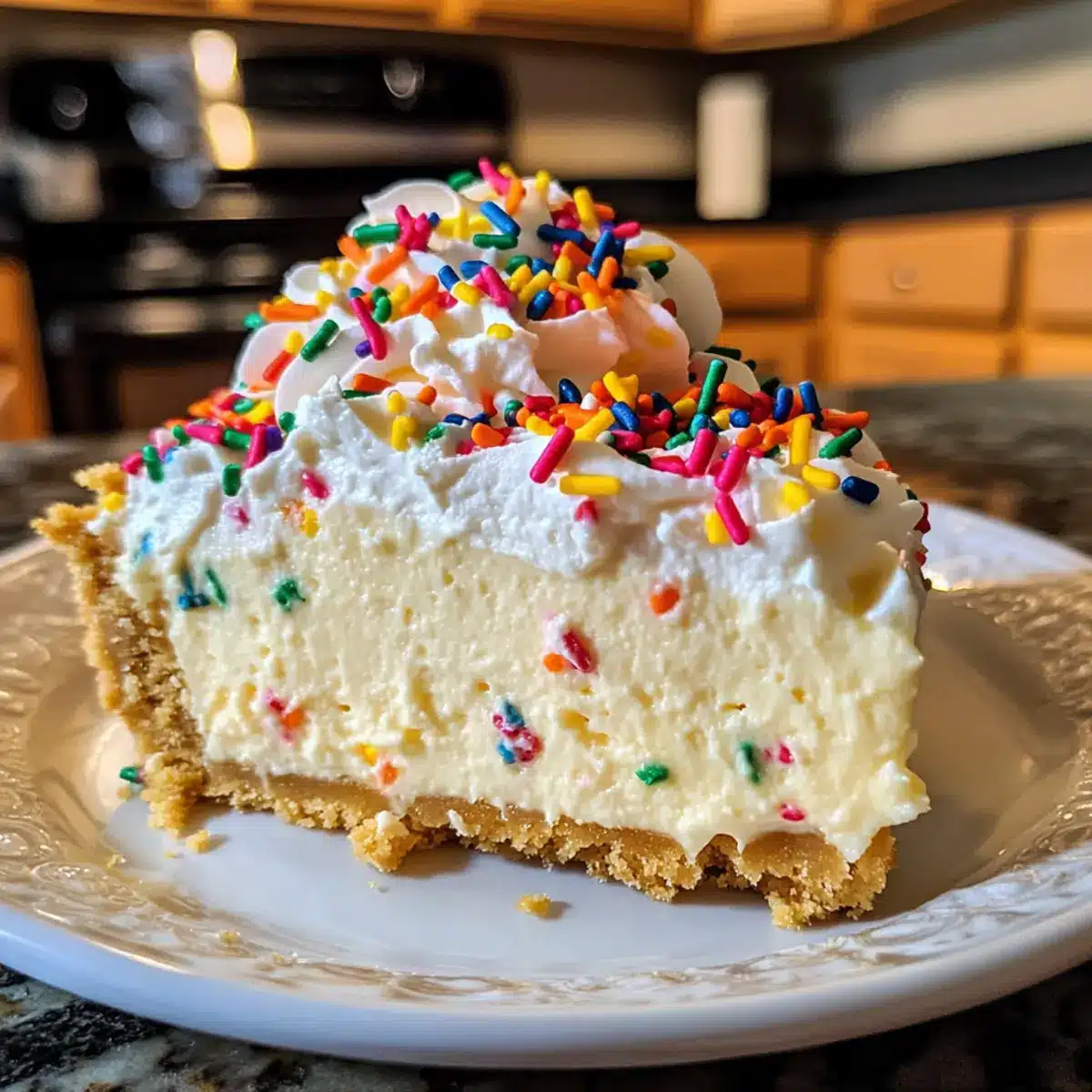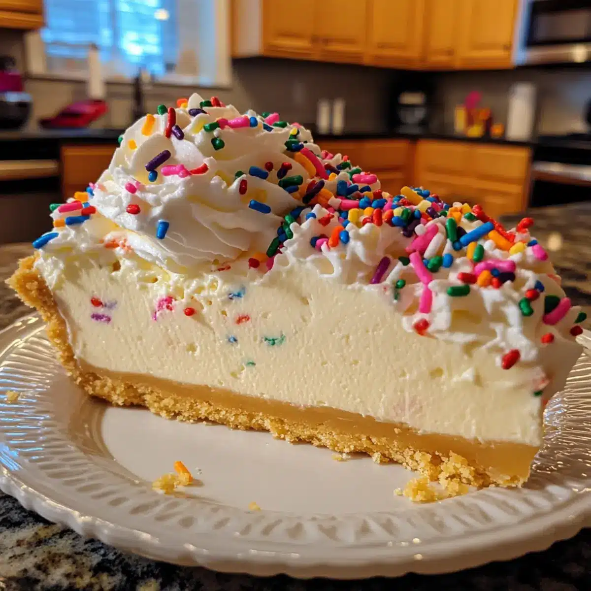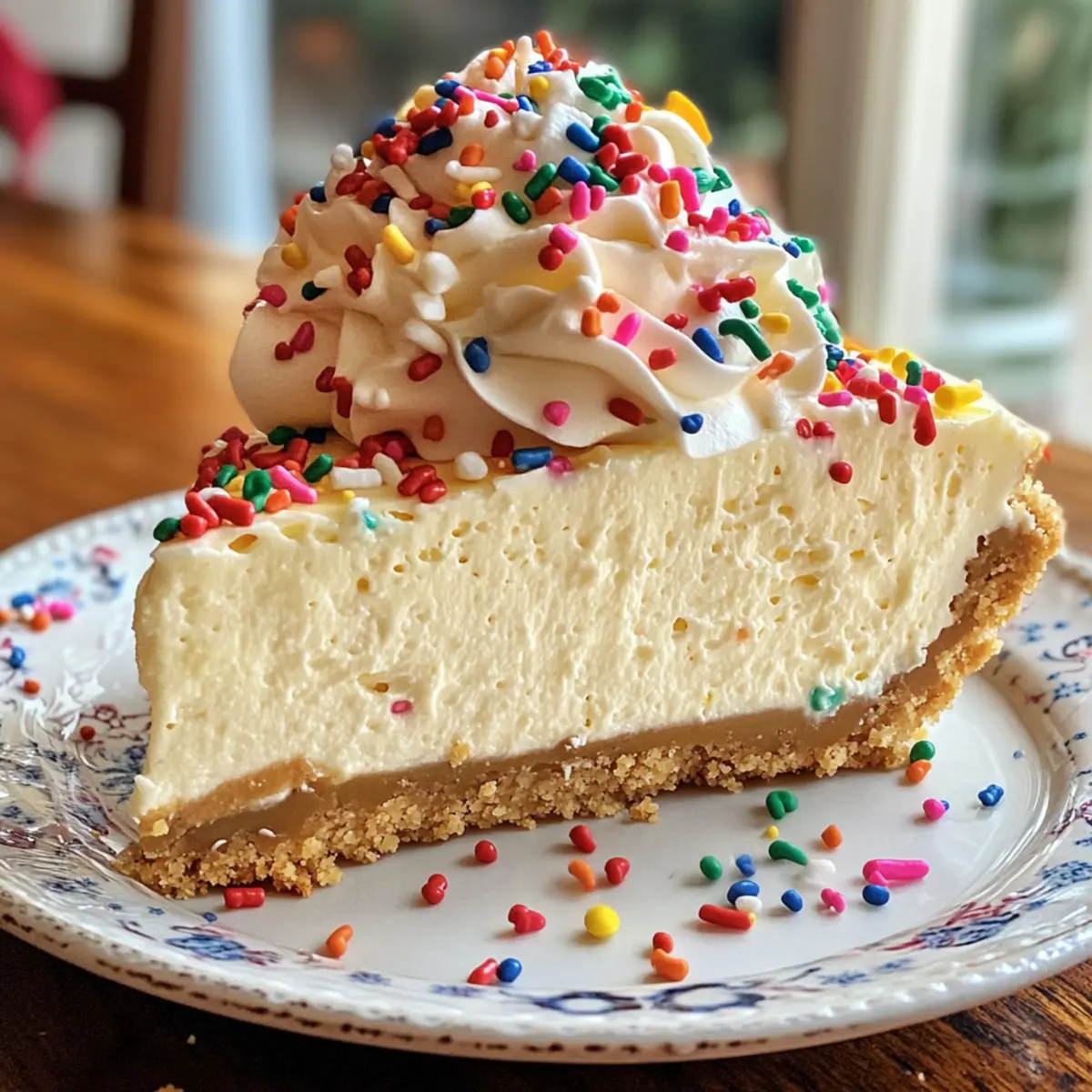 Eye-catching presentation: Topped with fluffy whipped cream and vibrant sprinkles, this cheesecake is as beautiful as it is delicious, making it a show-stopper at any gathering.