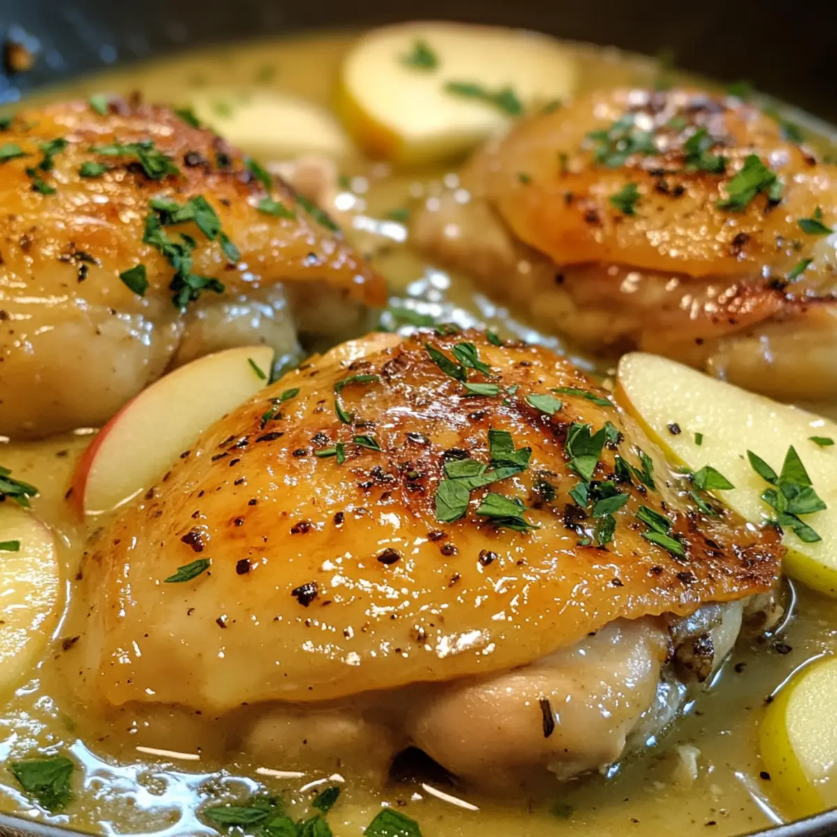 Return the seared chicken thighs to the skillet, placing them skin-side up. Cover the skillet with a lid and reduce the heat to low, allowing the chicken to simmer gently for 25-30 minutes. The chicken should reach an internal temperature of 165°F and be tender when finished, absorbing the apple and herb flavors.