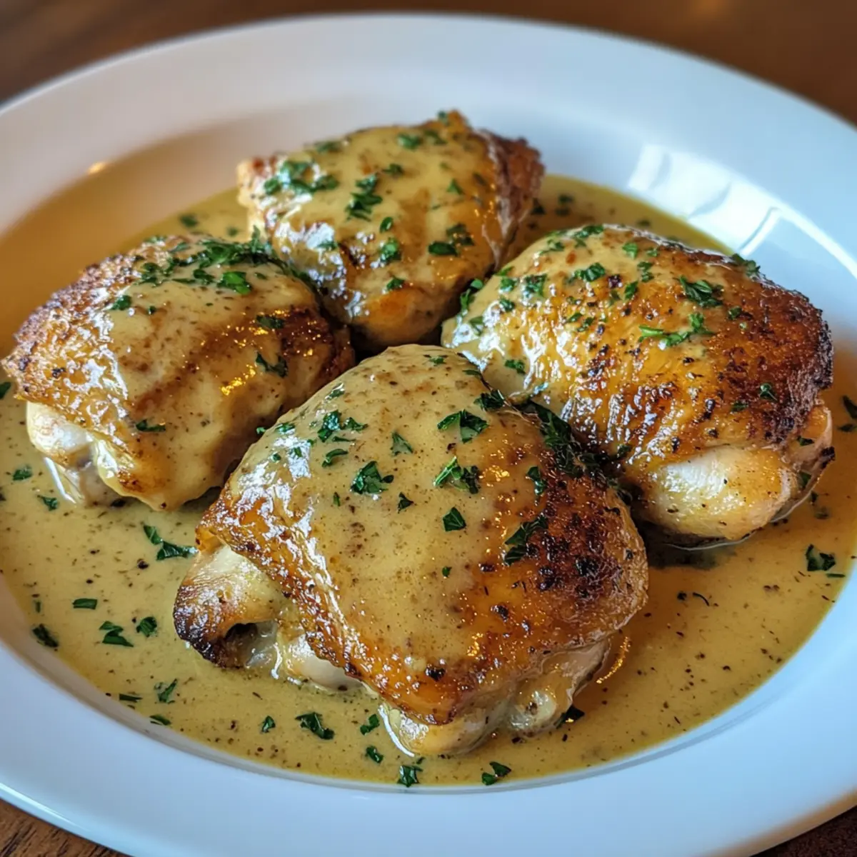 - Stir in chicken broth and whole-grain Dijon mustard, bring to a simmer, and return the chicken thighs to the skillet.