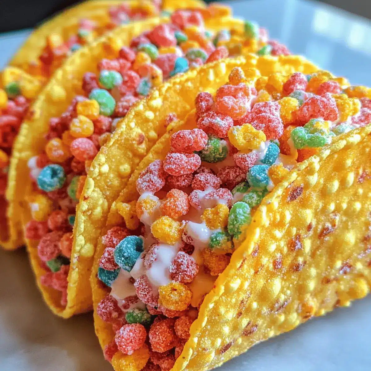 Room Temperature: Enjoy your Fruity Pebbles Cheesecake Tacos fresh for the best texture; they’re best served immediately after assembly.