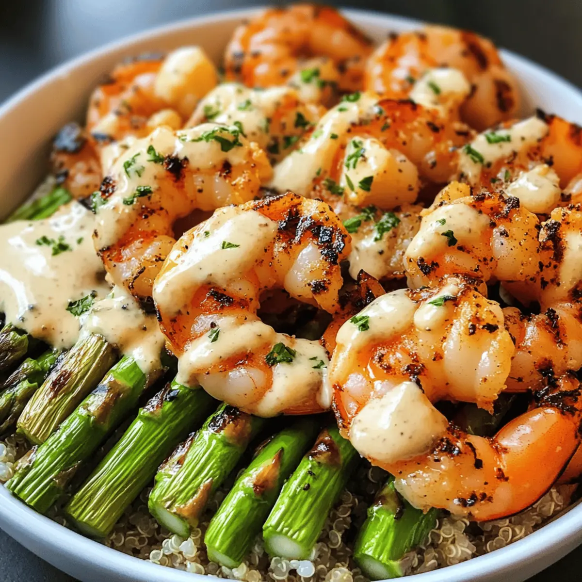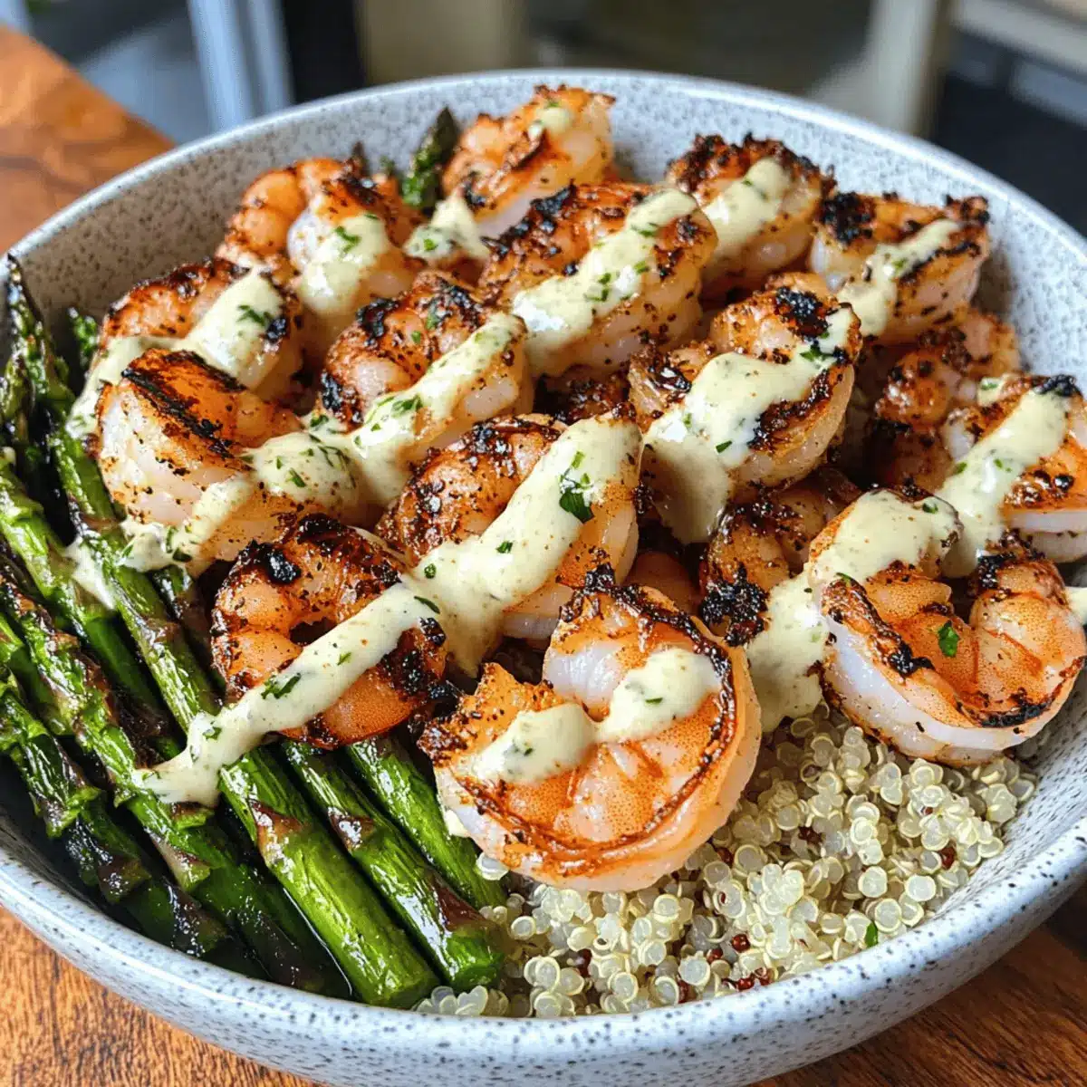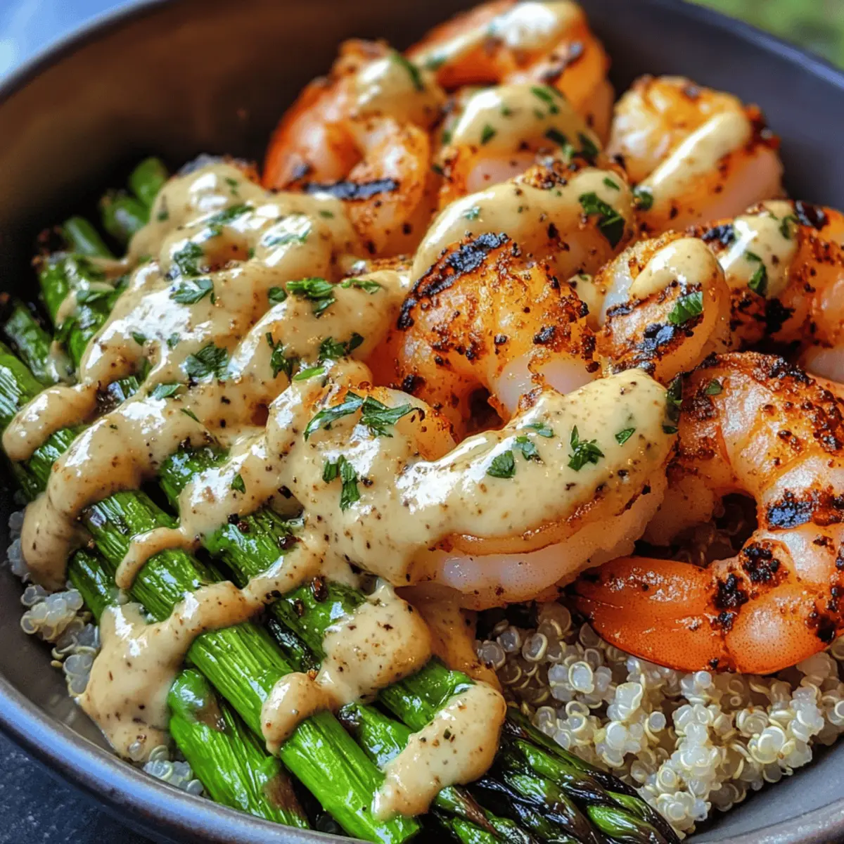 - Assemble the bowl with quinoa or rice, grilled asparagus, grilled shrimp, and drizzle with sauce.