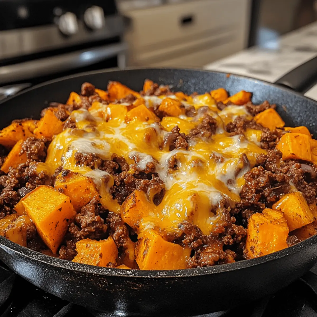 - Return ground beef mixture to the skillet, fold in with sweet potatoes. Sprinkle 1/2 cup of shredded cheddar cheese on top, cover for 1-2 minutes to melt cheese.