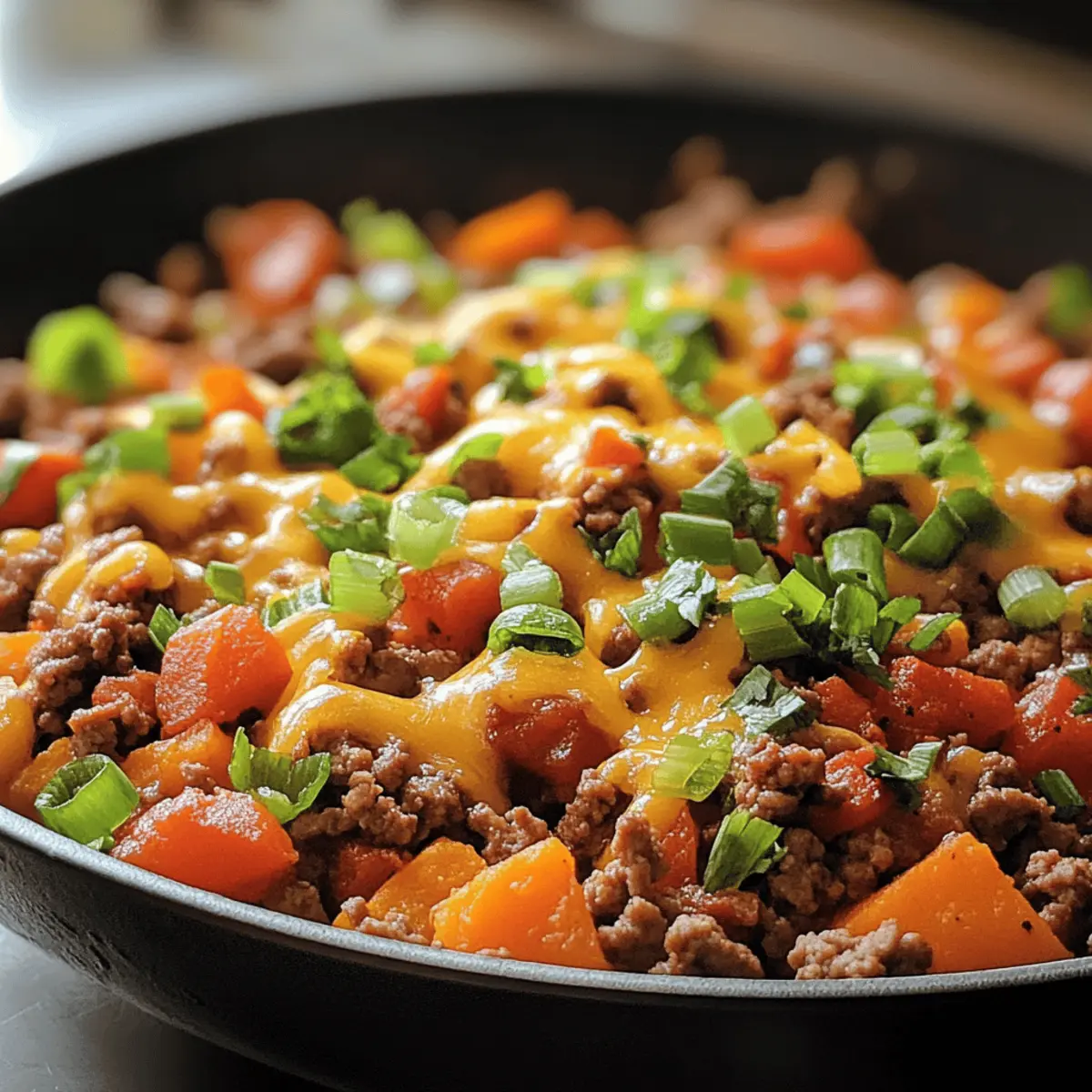 Once the sweet potatoes are cooked, return the ground beef mixture to the skillet, gently folding it in with the sweet potatoes and other ingredients. Sprinkle 1/2 cup of shredded cheddar cheese over the top. Cover the skillet for 1–2 minutes, allowing the cheese to melt and create a deliciously gooey topping that pulls the dish together beautifully.