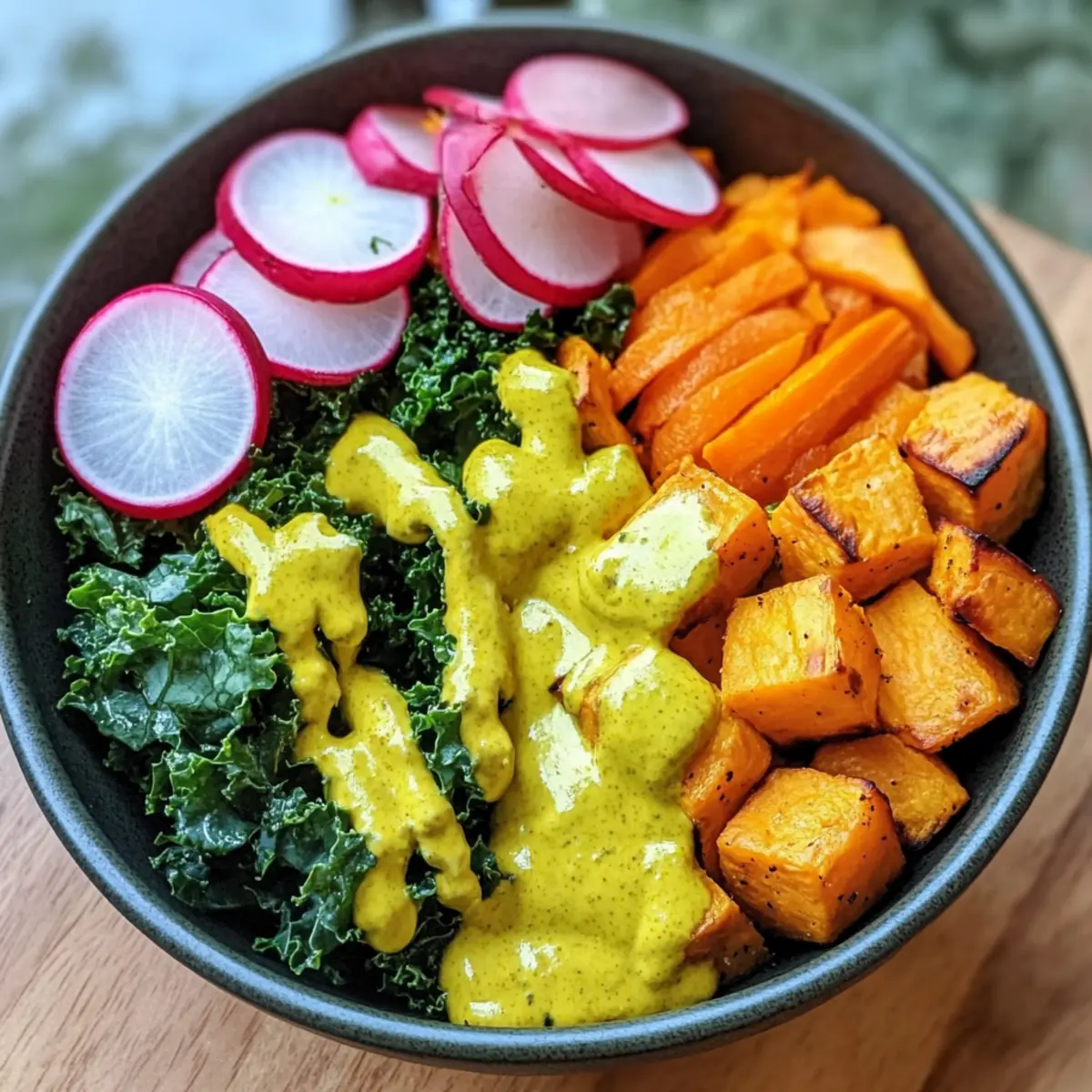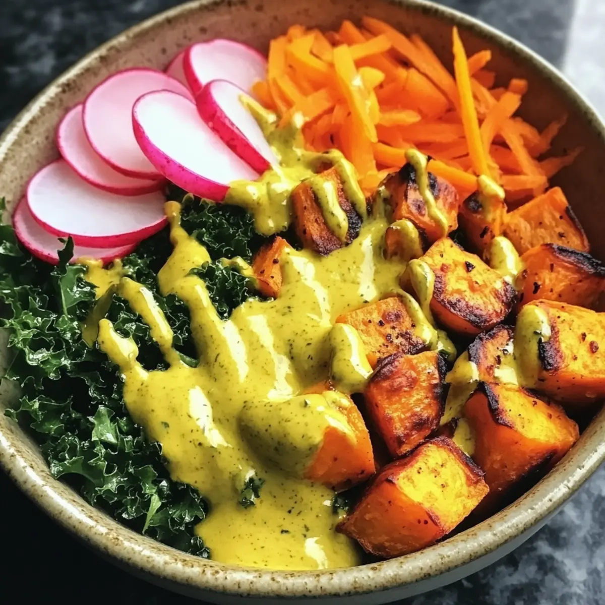 Once your sweet potatoes are roasted, it’s time to assemble your ultimate vegan Buddha bowl! Start by layering cooked brown rice or quinoa as your base. Next, add a generous portion of chickpeas or lentils for protein, followed by the massaged kale, carrot ribbons, radishes, shredded cabbage, and roasted sweet potatoes, ensuring vibrant colors shine through each layer.