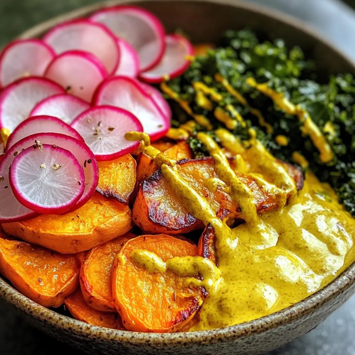 These Ultimate Vegan Buddha Bowls are a fantastic choice for meal prep! You can roast the sweet potatoes and prepare the turmeric tahini sauce up to 3 days in advance. Store the roasted sweet potatoes in an airtight container in the refrigerator, and keep the sauce separate to maintain freshness. Additionally, wash and slice the radishes, peel the carrots, and massage the kale a day ahead; just make sure to combine them in the bowl right before serving to avoid wilting. When you’re ready to enjoy, simply assemble the bowls by layering the prepared ingredients, adding the chickpeas, grains, and toppings for a nourishing meal that feels just as delightful as if freshly made!