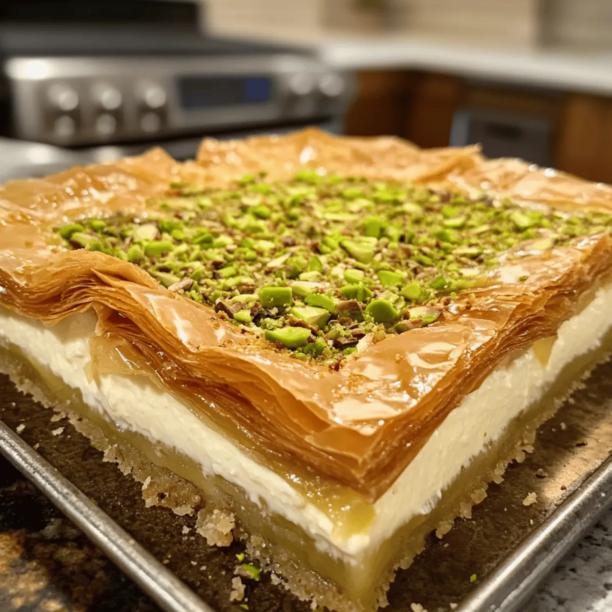 - Pour the cheesecake filling over baklava layers, smoothing the surface evenly.