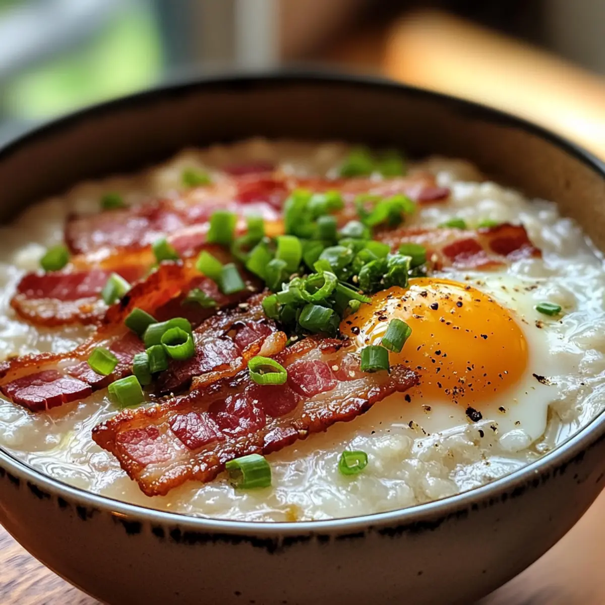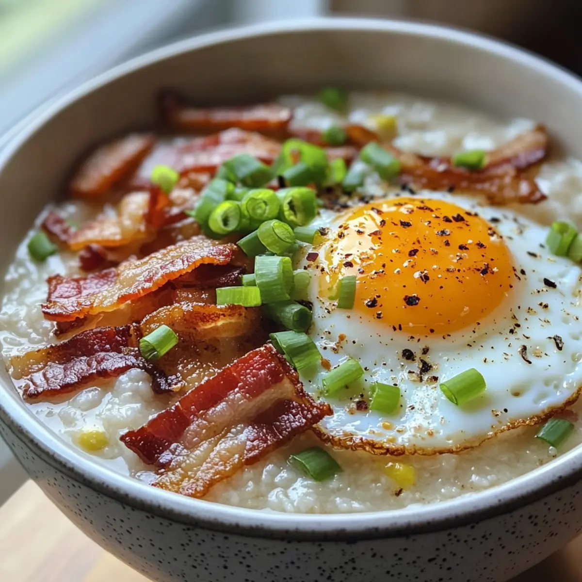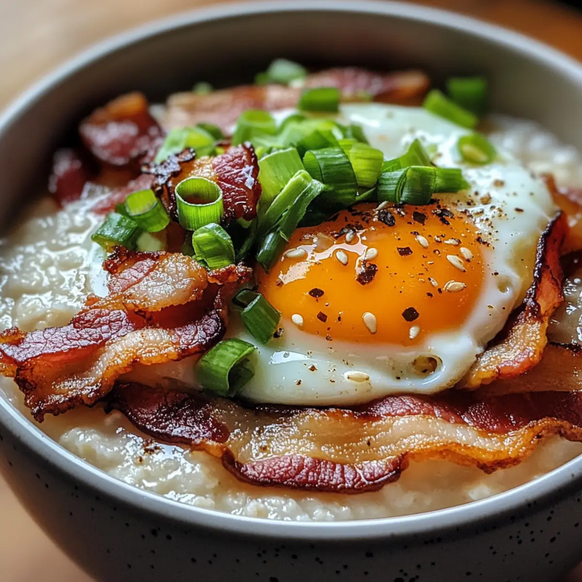 - Ladle the hot congee into bowls and top each with a fried egg, crumbled bacon, chopped green onions, drizzle with soy sauce, and sprinkle with homemade chili oil.