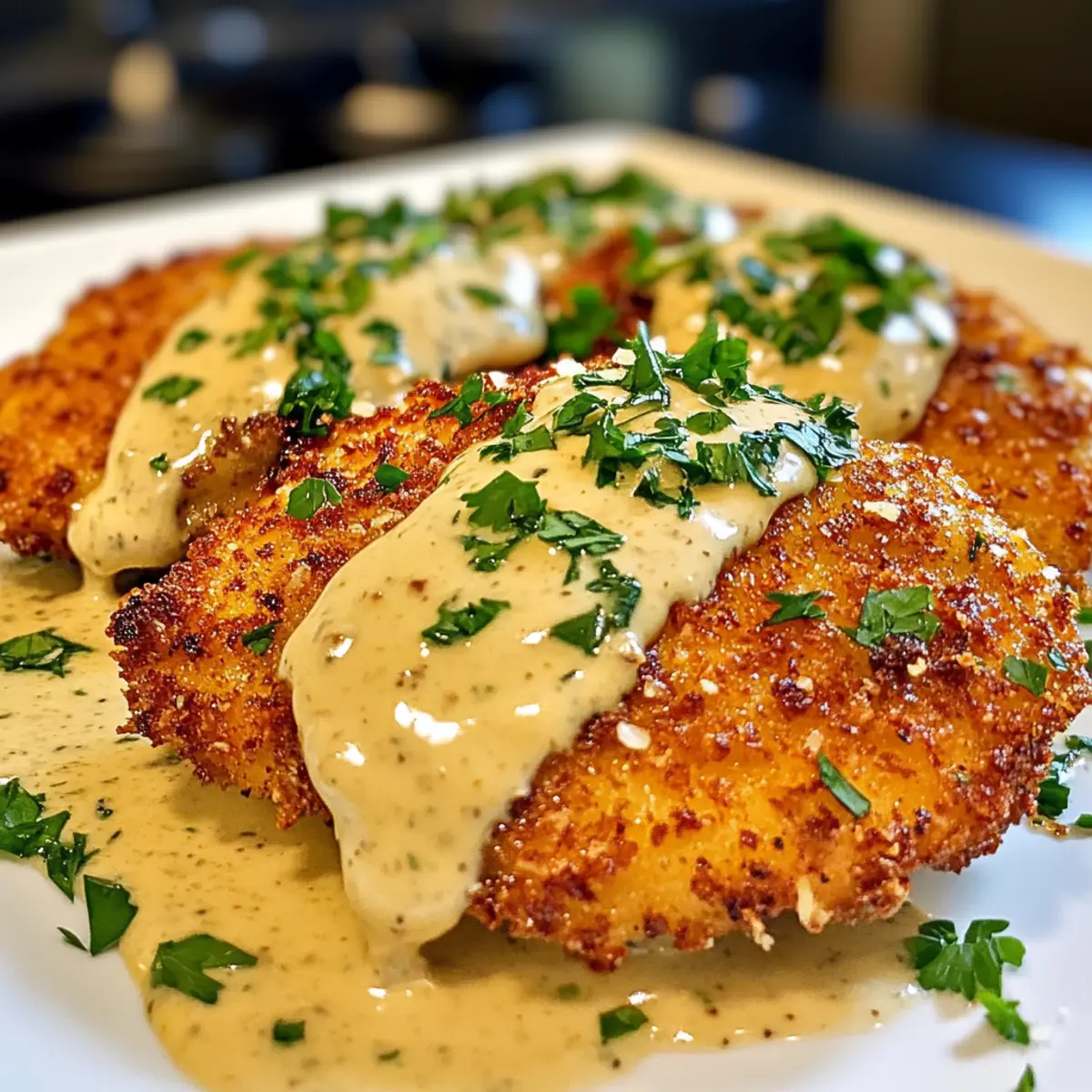 Plate the crispy Parmesan chicken, generously drizzling the garlic cream sauce over the top. Garnish with chopped fresh parsley for an added burst of color and freshness. This final touch elevates your dish, making your Crispy Parmesan Chicken with Garlic Cream Sauce a perfect centerpiece for your dinner table.