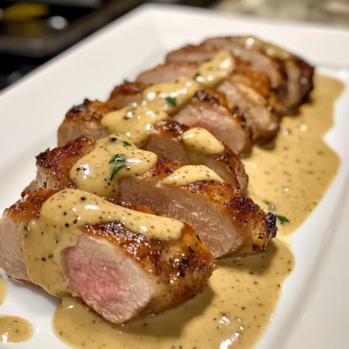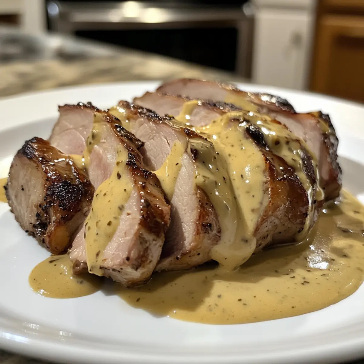 - Once the pork is done, let it rest for 5 minutes before slicing. Plate the pork slices and drizzle with the mustard cream sauce.