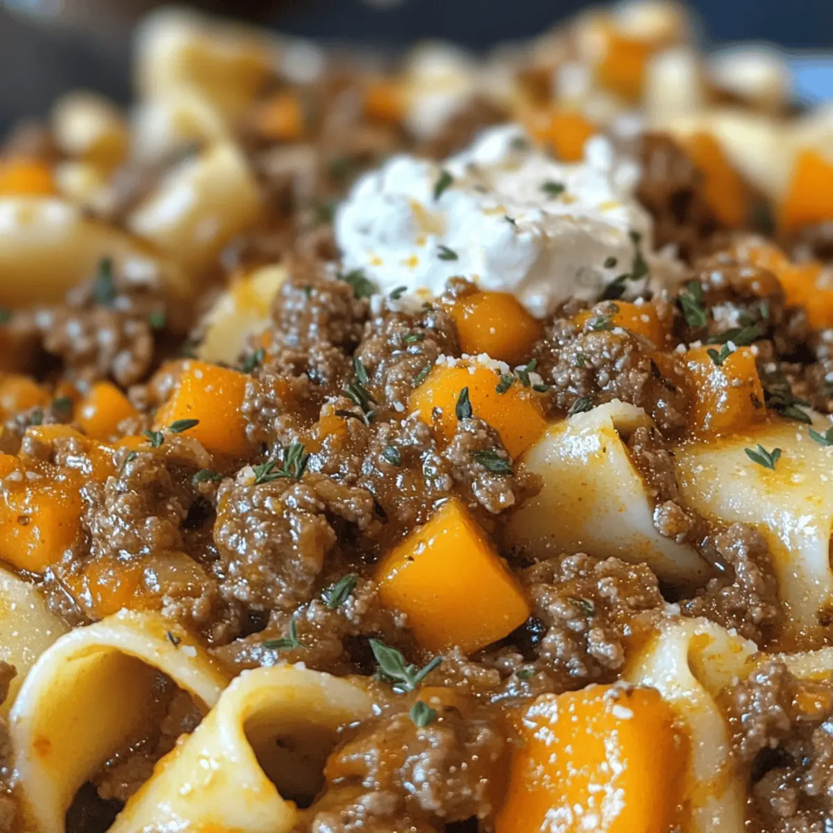 As I stirred the bubbling pot, the rich aroma of pumpkin and spices wrapped around me like a warm embrace, instantly transporting me to a cozy autumn evening. This Easy Pumpkin Beef Bolognese isn’t just a meal; it’s a hearty comfort food that transforms ordinary ingredients into something extraordinary. With hearty chunks of pumpkin that meld beautifully into the savory sauce, each bite offers a delightful balance of sweet and savory, making it the perfect dish to warm your soul. Plus, it’s incredibly flexible—you can swap out the ground beef for pork or chicken and use pumpkin purée instead of diced pumpkin to fit whatever you have on hand. Ready to dive into a one-pan wonder that’s quick to prepare and sure to impress? Let’s get cooking!