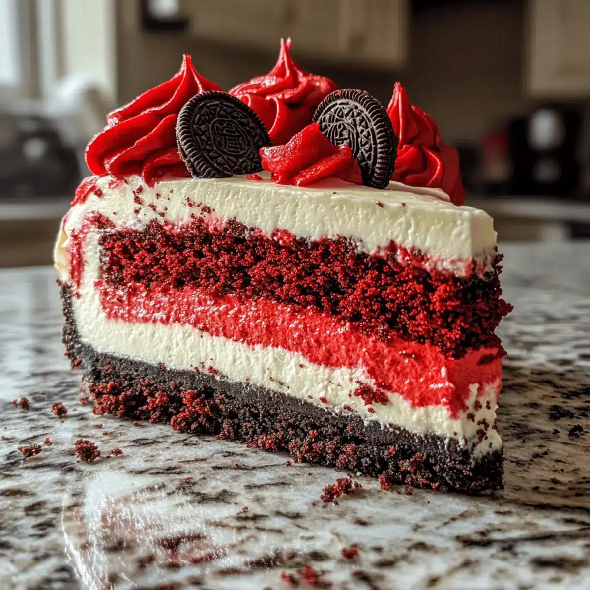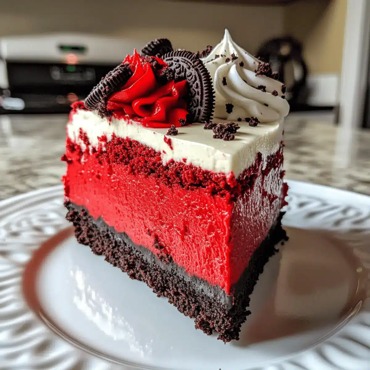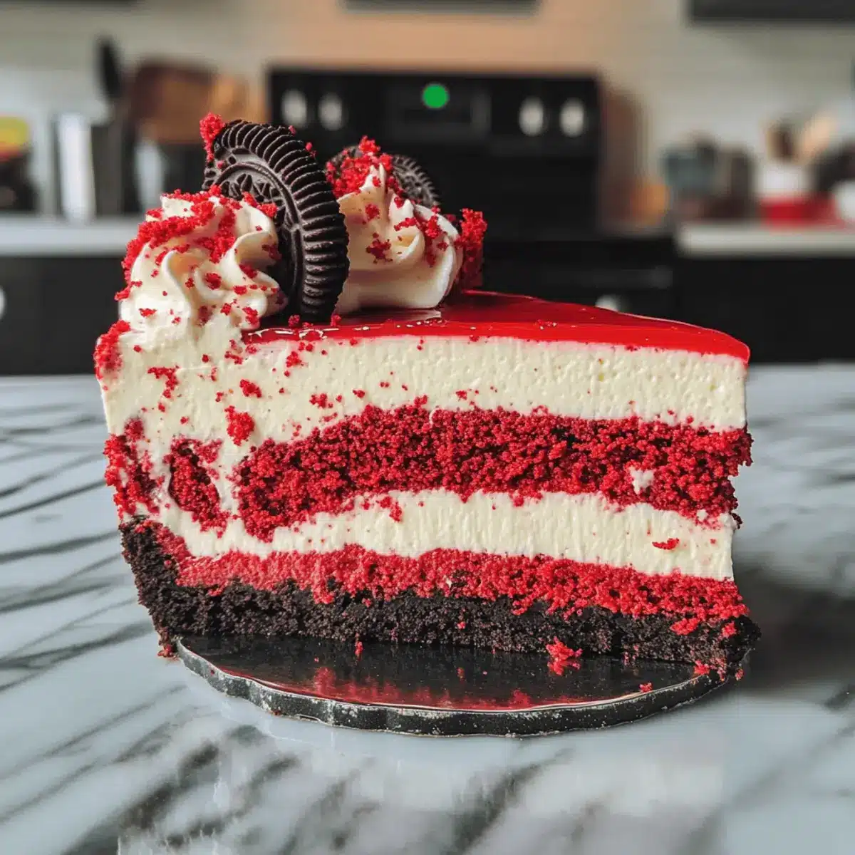 Get ready to indulge in this delightful Red Velvet Oreo Cheesecake!