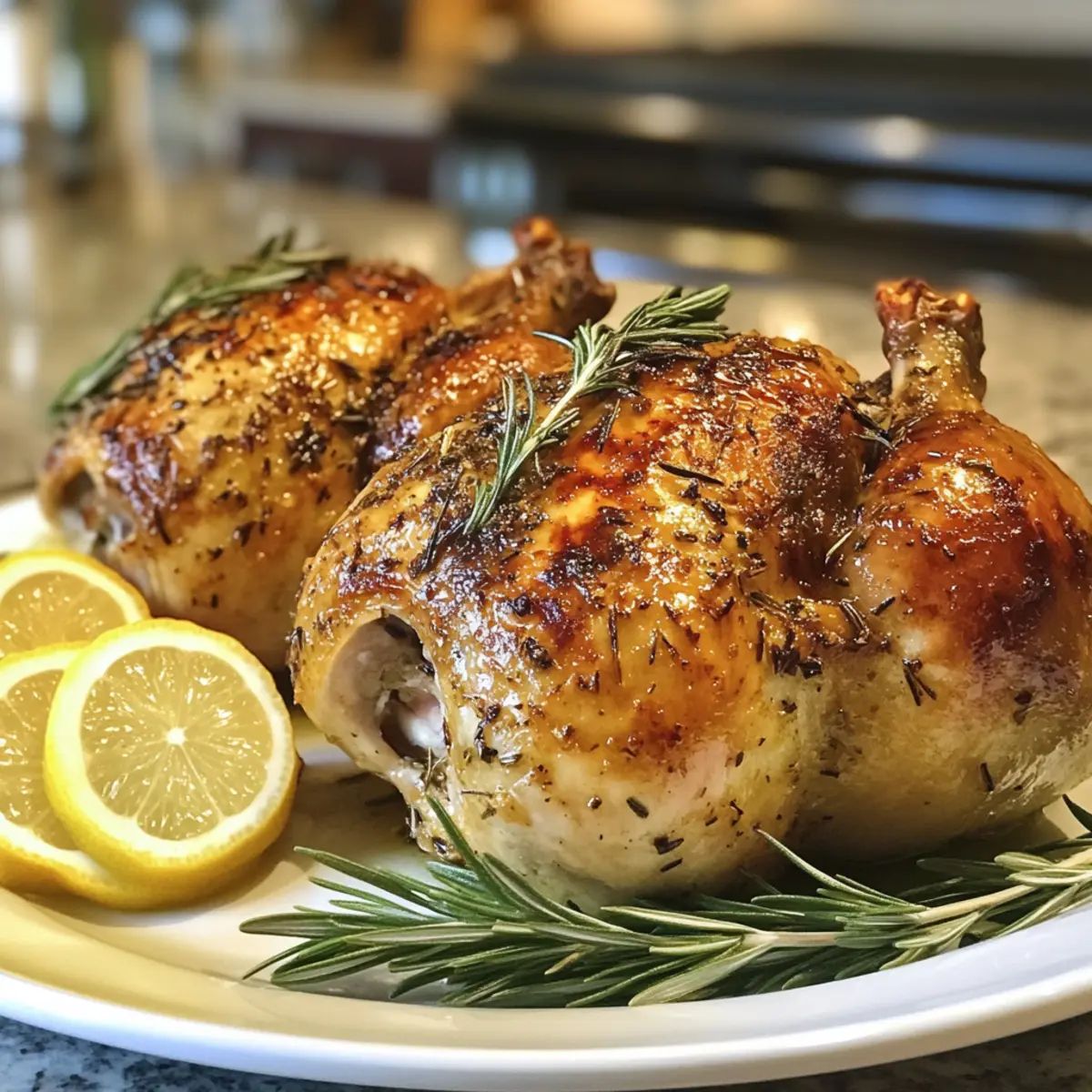- Tuck lemon slices and sprigs of rosemary into each hen's cavity.