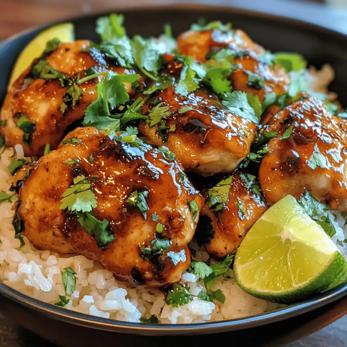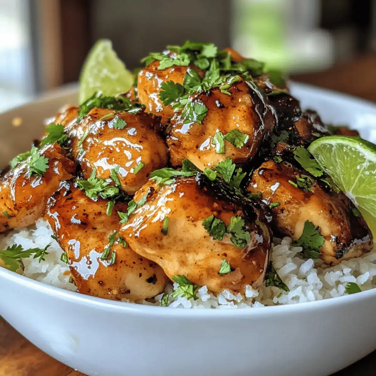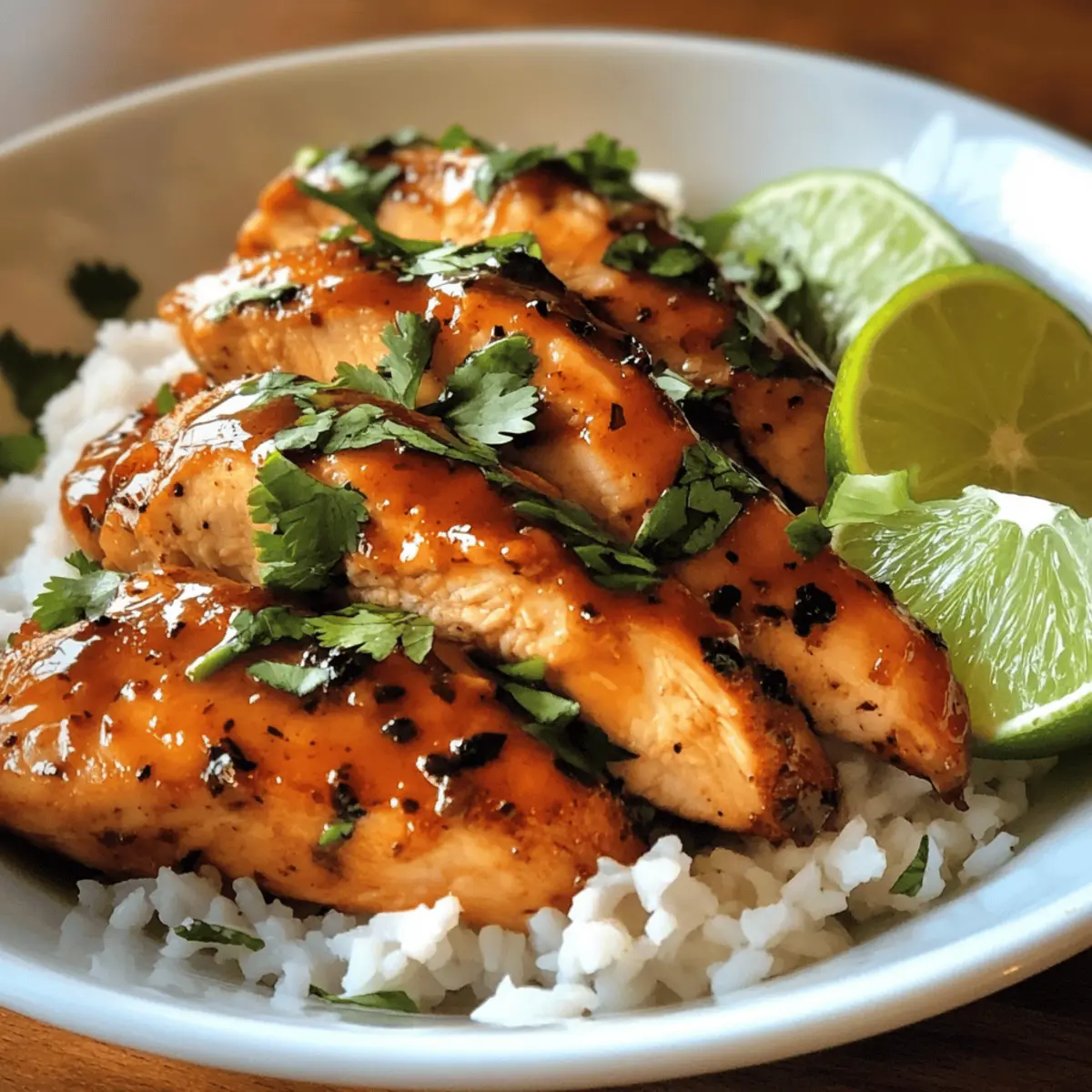 - Serve coconut rice in bowls, top with sliced chicken and drizzle with glaze. Garnish with cilantro, lime wedges, toasted coconut flakes, and green onions.