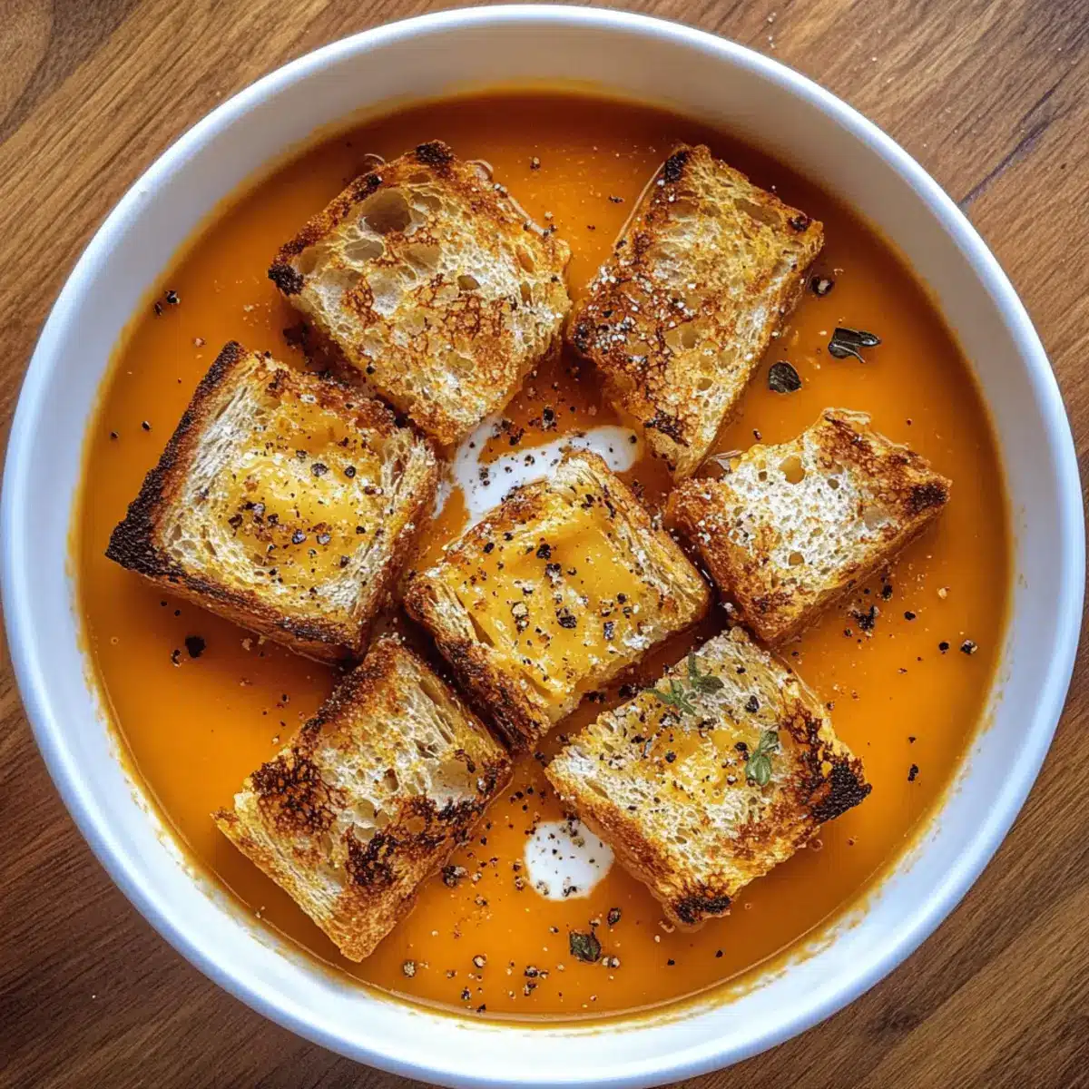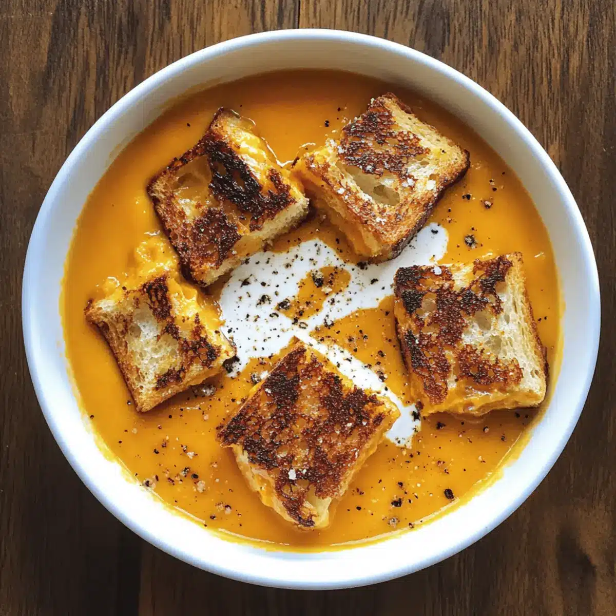 - Ladle the soup into bowls, top with grilled cheese croutons, and drizzle with additional cream if desired.