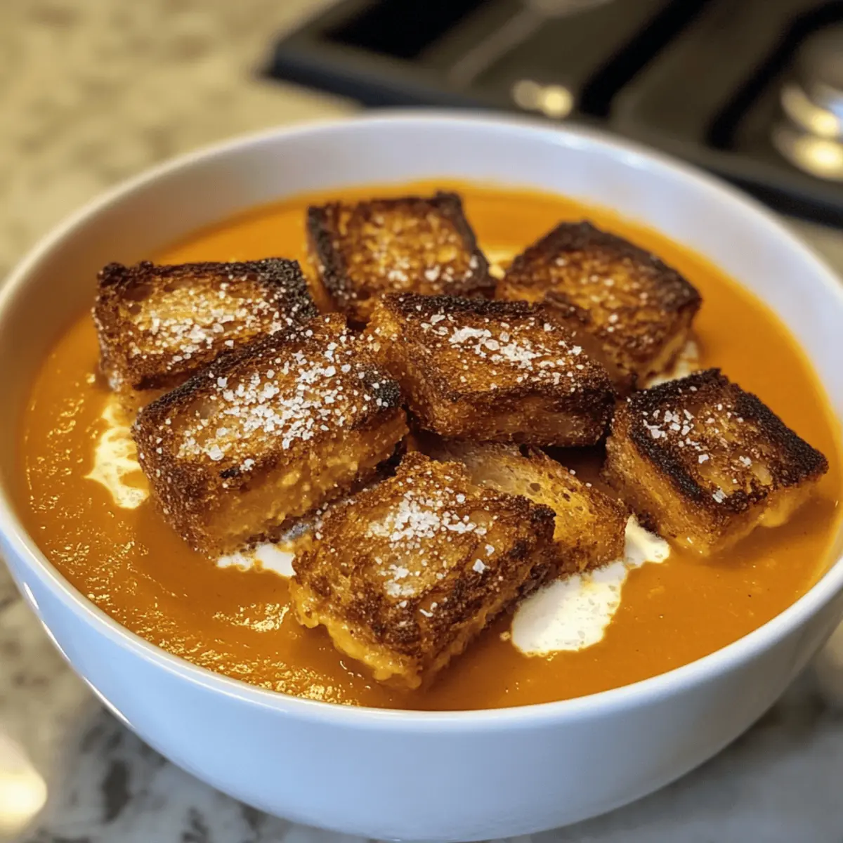 Ladle the creamy Spicy Pumpkin Soup into bowls and generously top with the grilled cheese croutons. For a finishing touch, drizzle with additional cream and sprinkle with flaky sea salt. The vibrant colors and mouthwatering aromas will make this dish a cozy centerpiece at your dining table.