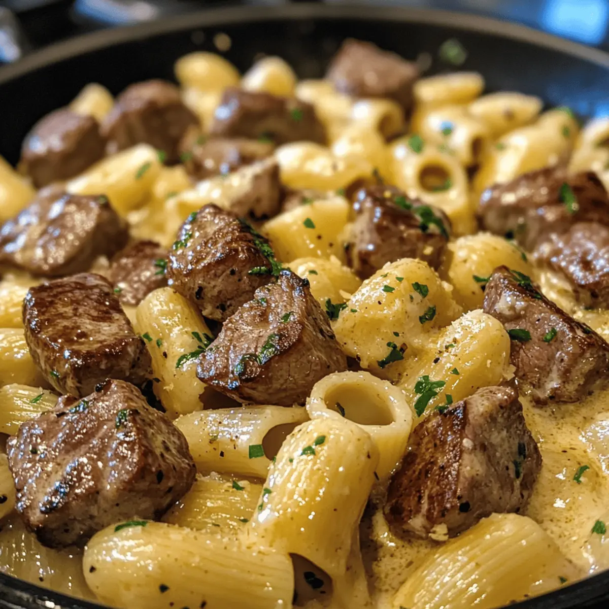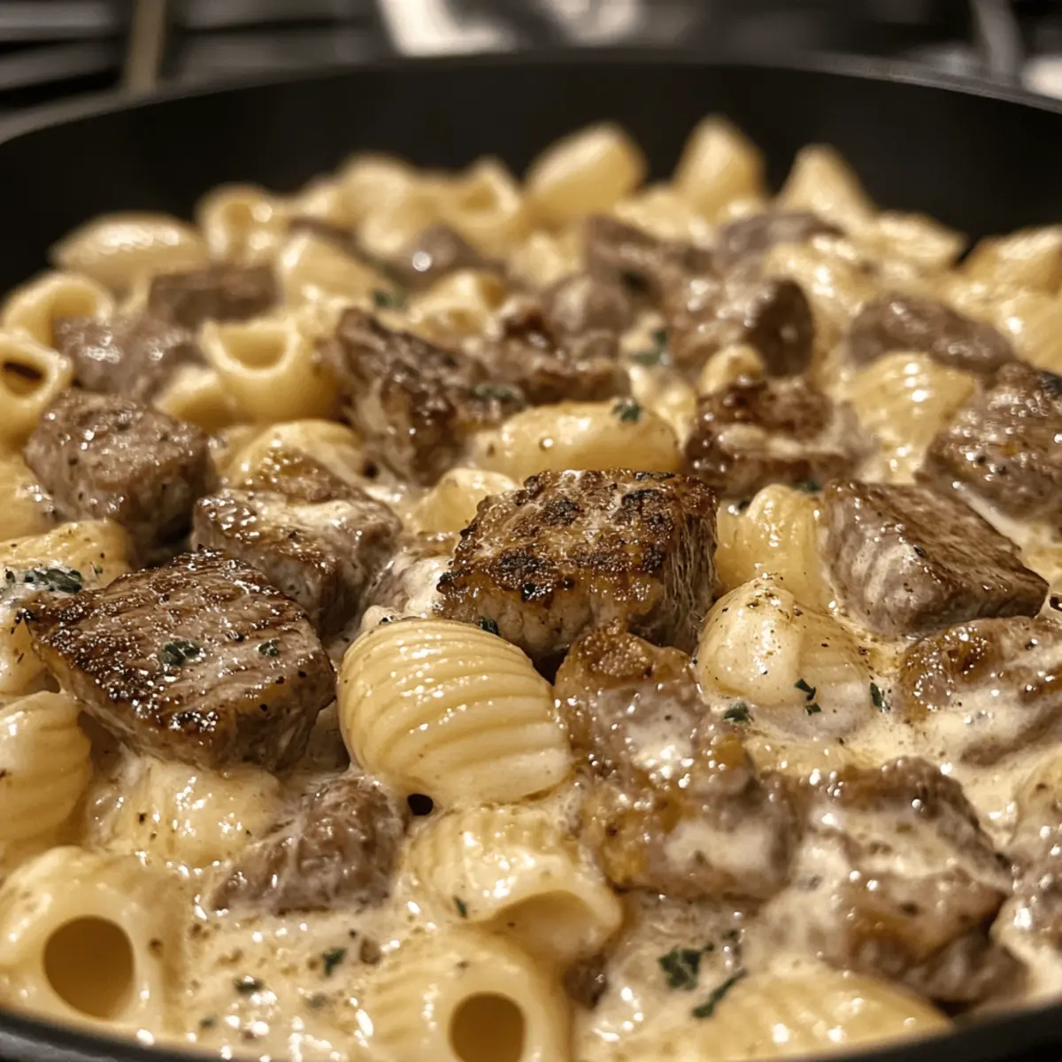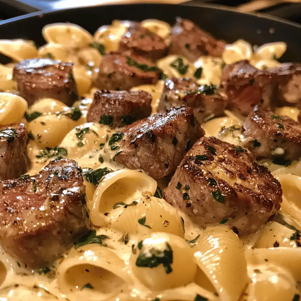 Steak Bites and Shell Pasta in Creamy Garlic Butter Alfredo