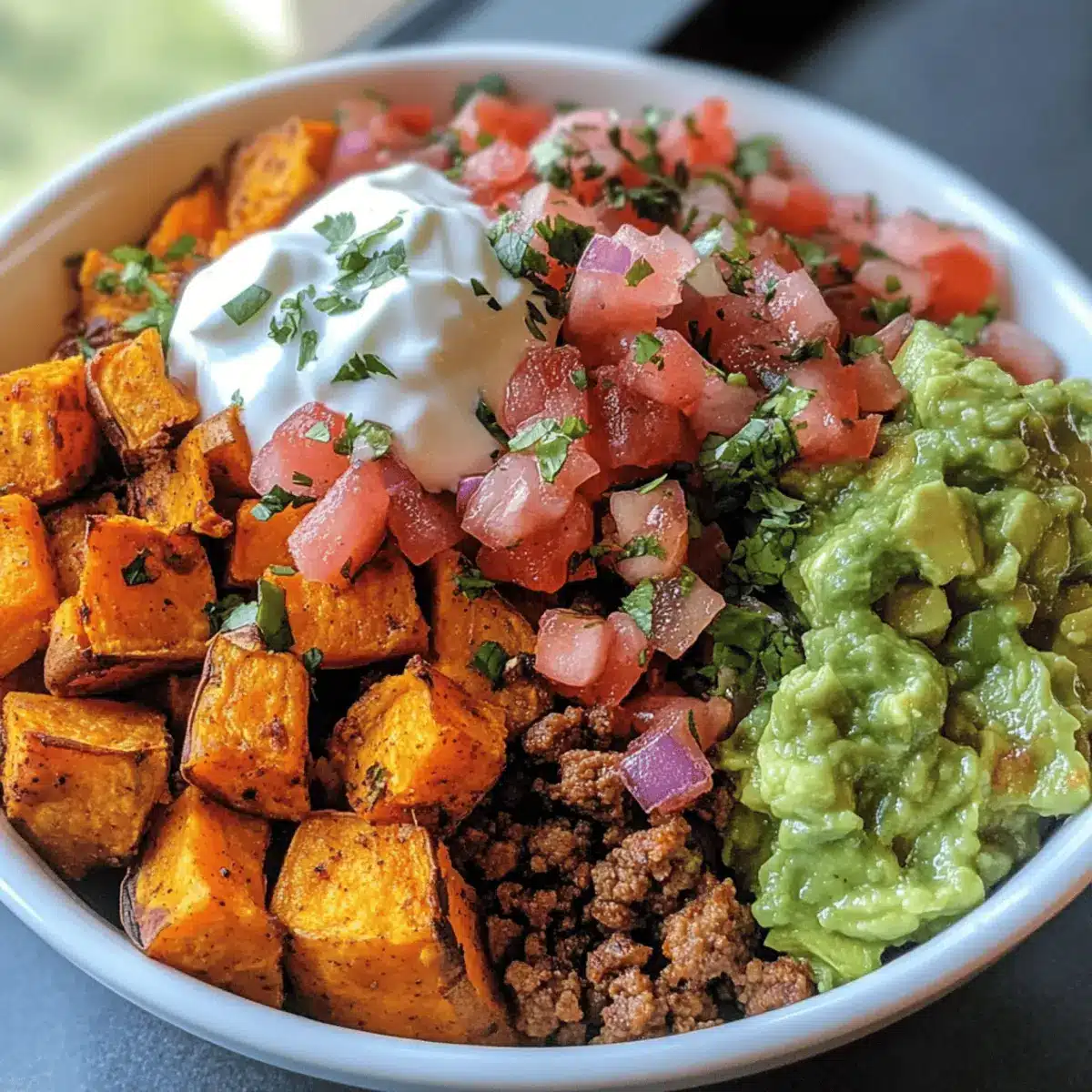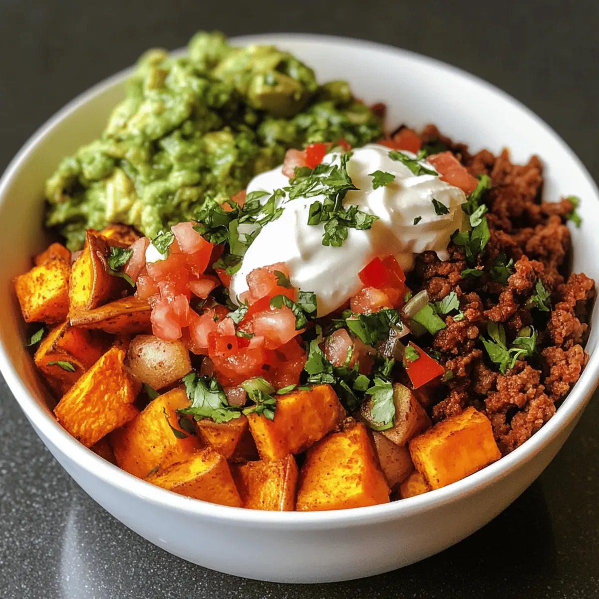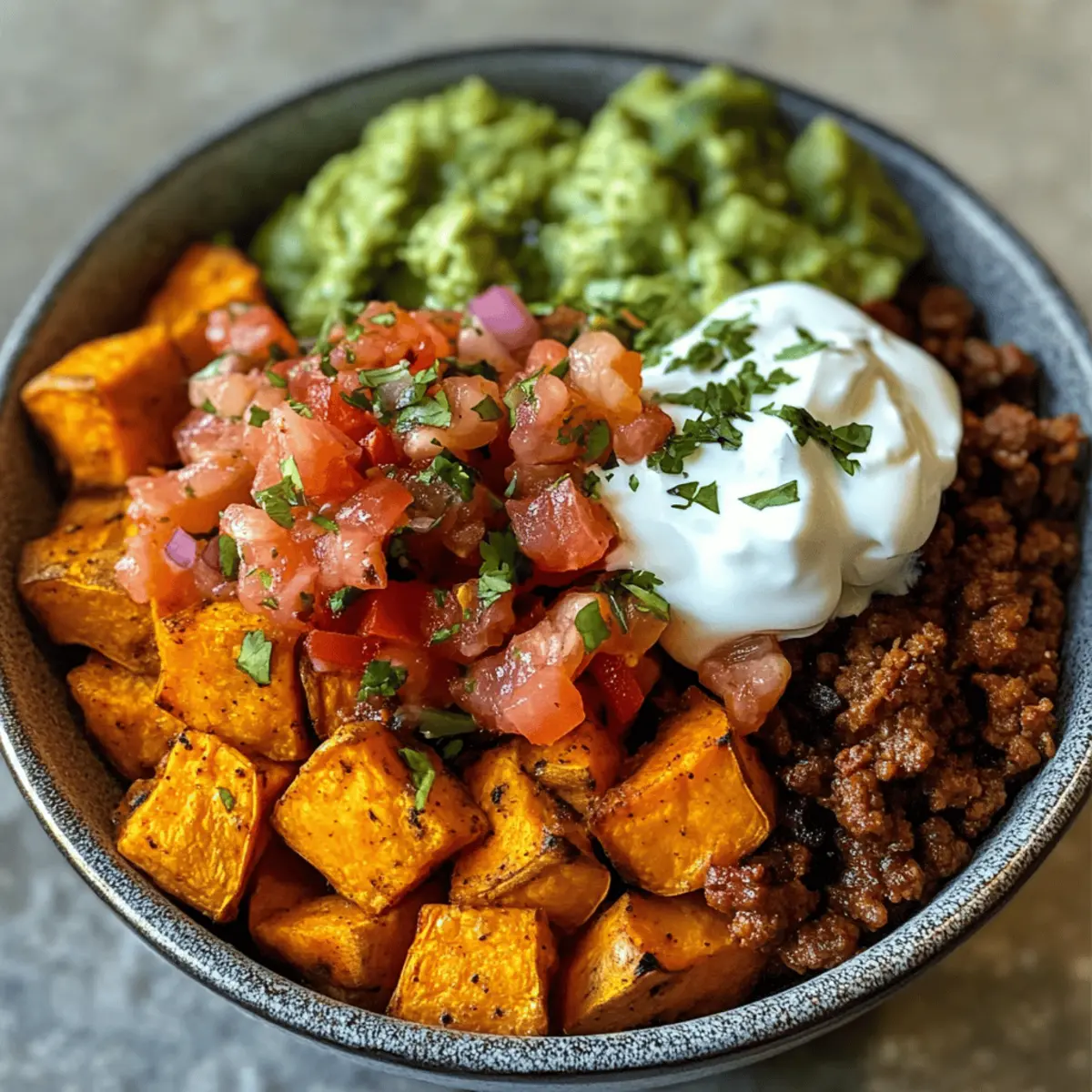 - Assemble your bowl starting with roasted sweet potatoes, add seasoned ground beef, pico de gallo, and guacamole. Drizzle with sour cream and add optional toppings.